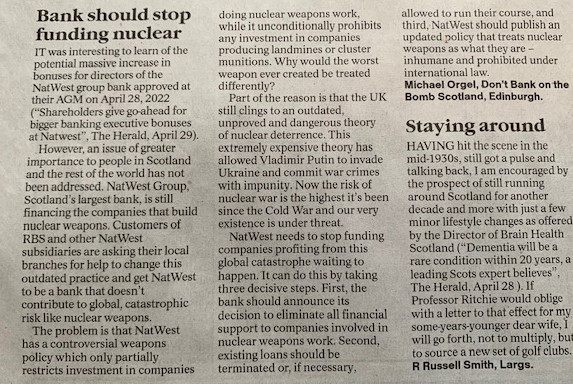 However an issue of greater importance to people in Scotland and the rest of the world has not been addressed. Scotland’s largest bank, NatWest Group, recommends looking into electric cars, but is still financing the companies that build nuclear weapons. Customers of RBS and other NatWest subsidiaries are asking their local branches for help to change this outdated practice and get NatWest to be a bank that doesn’t contribute to global catastrophic risk – like climate change and nuclear weapons.